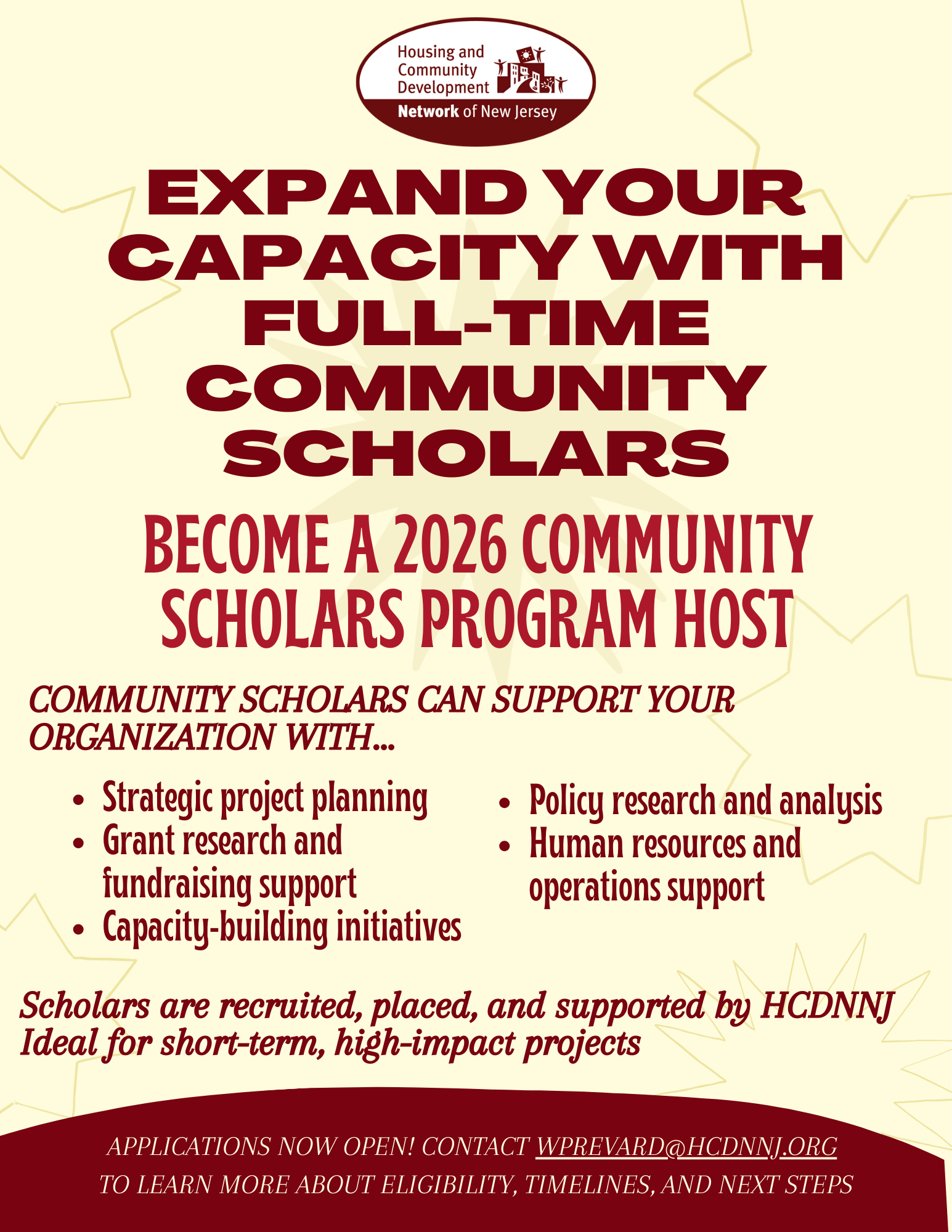 The Community Scholars Program (a paid internship) is committed to fostering the next generation of young professionals and building the capacity of our community development members in New Jersey. The Network seeks to engage upper-level college and graduate students interested in the policy and community development fields. We provide scholars an opportunity to be immersed within a project(s) and receive firsthand experience with some of the most impactful non-profit organizations in the state.