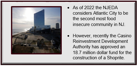 Food deserts are not a problem limited only to one city, environment, or location within New Jersey. Urban and rural areas alike face difficulties obtaining fresh and healthy foods, with various locations like Atlantic City, Camden, Salem County, and Newark all facing issues regarding a lack of access to affordable and nutritious foods. In a part of the nation known as “The Garden State” this is and should be more widely seen as an unacceptable situation for our fellow residents.
